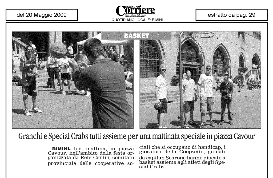 La società Basket Rimini Crabs comunica che martedì mattina, nell’ambito della festa cittadina organizzata da Rete Centri, il comitato provinciale delle cooperative sociali che si occupano di handicap, piazza Cavour sarà teatro di un allenamento dimostrativo che vedrà scendere in campo insieme i giocatori e i membri dello staff della Coopsette e gli Special Crabs. Per un’ora circa – a partire dalle 11.30 – il grande basket si “impadronirà” della città, per ribadire ancora una volta come la pallacanestro rappresenti a Rimini non solo uno spettacolo per appassionati, ma uno strumento sociale a forte valenza educativa, che, dai bambini alla prima squadra, passando attraverso i ragazzi diversamente abili, offre un importante percorso di crescita. Non mancate.